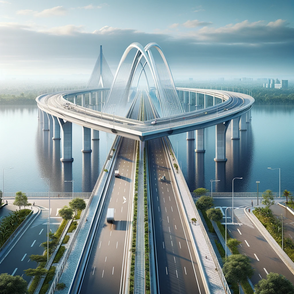 In the brilliance of daylight, a striking modern two-way bridge elegantly stretches across a wide river. Its architectural design boasts sleek, minimalist lines, creating a vision of sophistication and innovation. The bridge’s structural beauty harmonizes seamlessly with the river’s grandeur, symbolizing a union of human ingenuity and nature’s majesty. Sunlight dances upon the bridge’s pristine surfaces, accentuating its graceful form and emphasizing the tranquil flow of the river below. This daytime vista is a testament to contemporary architectural excellence and the timeless allure of nature’s landscapes.