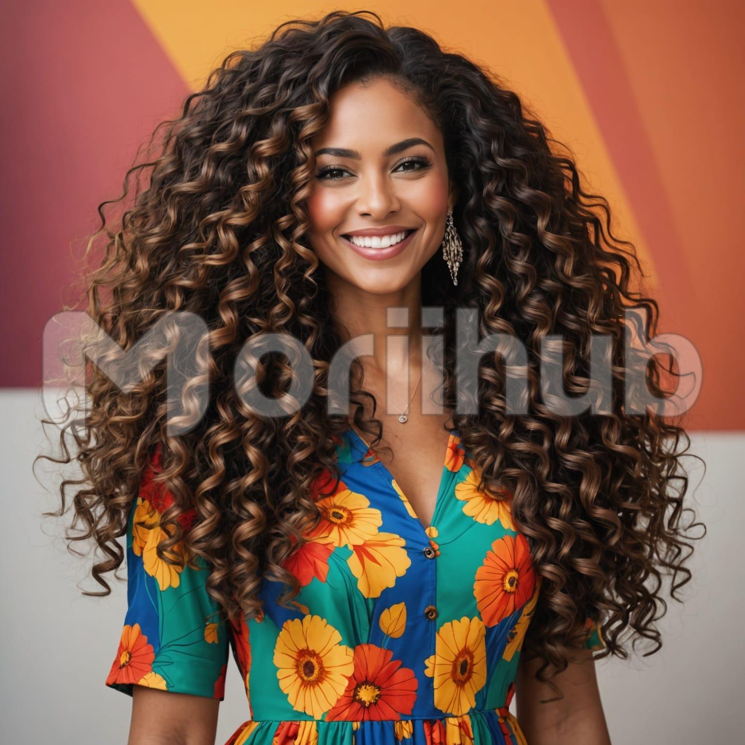 A woman beams with a radiant smile, her eyes sparkling with joy. She wears a vibrant, colorful gown that flows gracefully, its rich hues creating a mesmerizing pattern. Her lustrous hair cascades in soft, glossy waves, catching the light and adding to her lively presence. The gown’s vivid colors complement her cheerful demeanor, while her radiant smile exudes warmth and confidence. The overall effect is both captivating and uplifting, as if her joyful spirit brings the entire scene to life.