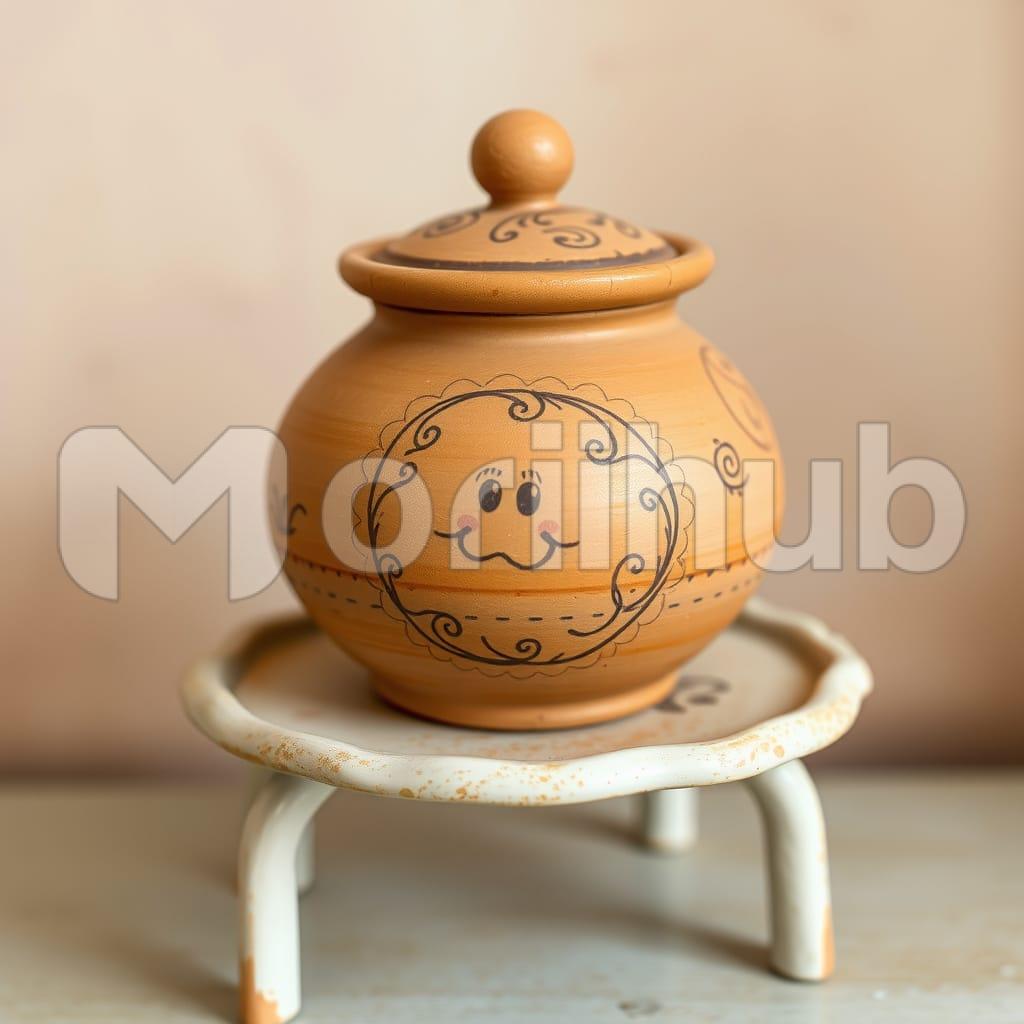 A little clay pot rests on a quaint table, its rounded form simple and modest. A playful doodle wraps across the pot’s surface, giving it a touch of character. The texture is coarse, unpolished, with soft indentations that hint at its handmade nature. It sits alone, steady and still, in the center of the table. The setting is quiet, the table’s surface slightly worn, adding to the pot’s understated presence. The doodle adds charm, bringing a personal, almost whimsical note to the humble piece. Nothing else draws attention away.