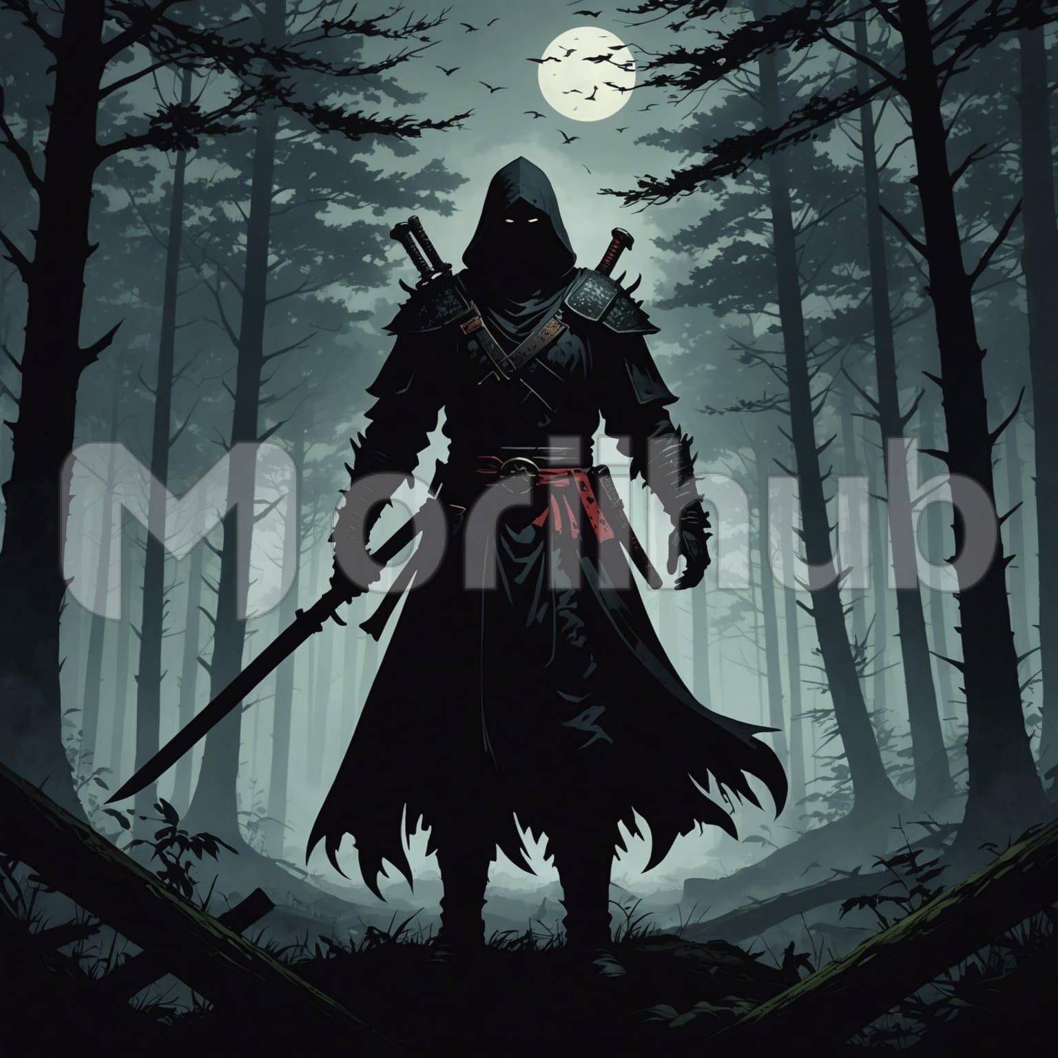 Beneath the moon’s luminous gaze, a hooded warrior prowls the shadowed depths of the forest, his figure a silhouette against the silvered canopy. With each step, he moves with silent purpose, the hilt of his sword gleaming in the pale light. The ancient trees whisper secrets as he navigates the tangled undergrowth, his senses attuned to the symphony of the night. In his solitary vigil, he is both guardian and sentinel, a lone sentinel against the darkness, his blade a steadfast companion in the face of unseen perils.