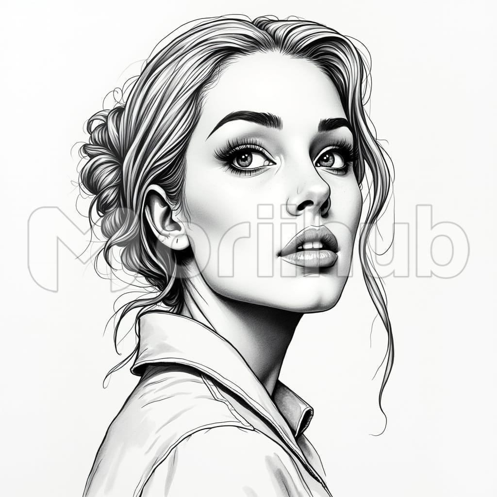A sketch depicts a woman with her gaze directed forward, eyes focused and calm. Her short hair frames her face, drawn with soft, deliberate strokes. The lines capture her posture, slightly tilted as she looks ahead, poised and composed. Her expression is thoughtful, unhurried, and her presence seems calm yet attentive. There’s a quiet elegance in the simplicity of the drawing, with minimal detail that allows her expression to take center stage. The subtle lines convey a sense of quiet observation, emphasizing her still, reflective nature.