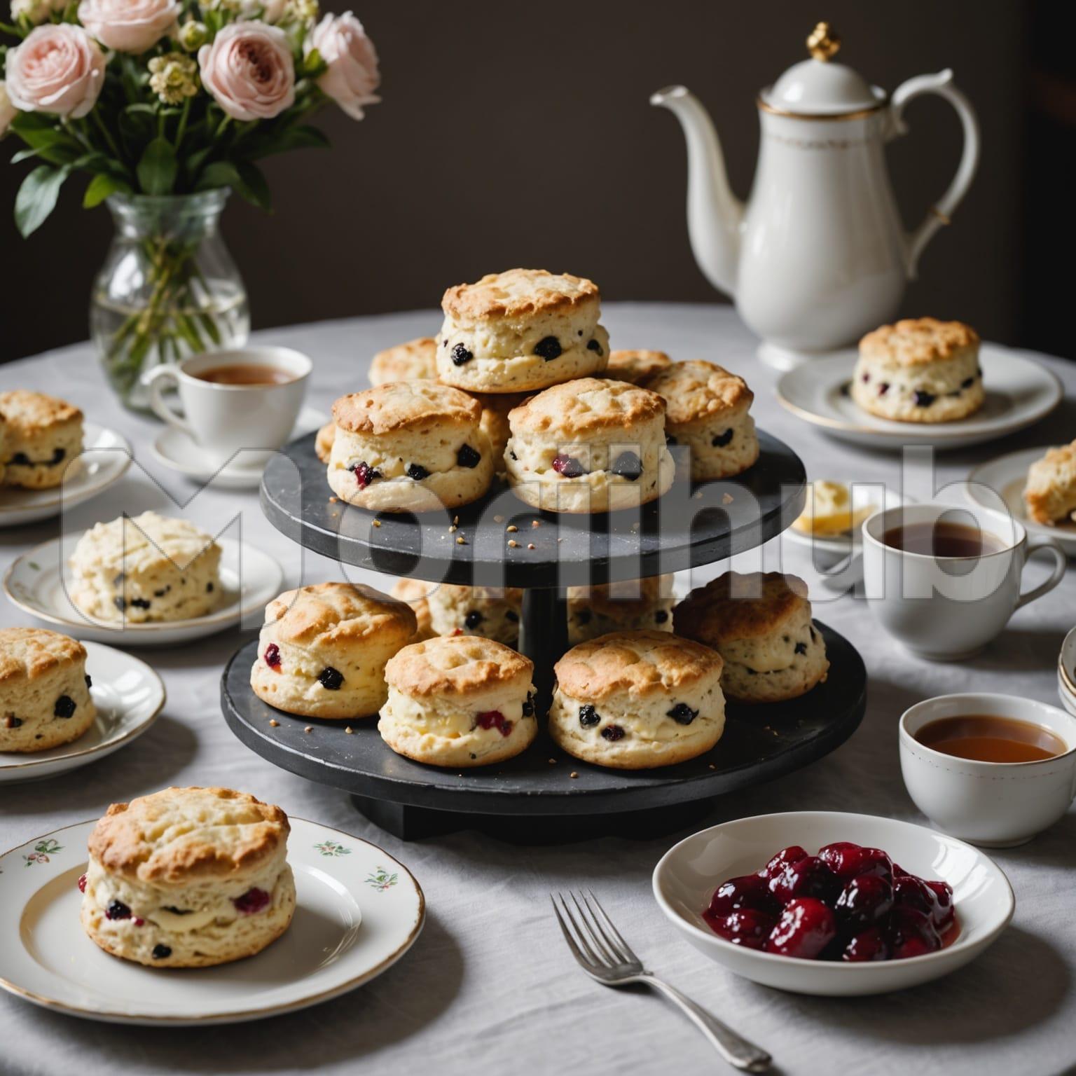 Scones rest on plates atop the table, their slightly crisp edges giving way to a soft, inviting texture. The arrangement feels warm and inviting, a perfect pairing for the cups of coffee placed around them. The rich aroma of coffee blends with the buttery scent of freshly baked scones, creating a simple yet comforting scene. The table setting suggests a moment of quiet enjoyment, where flavors and textures come together in perfect harmony.