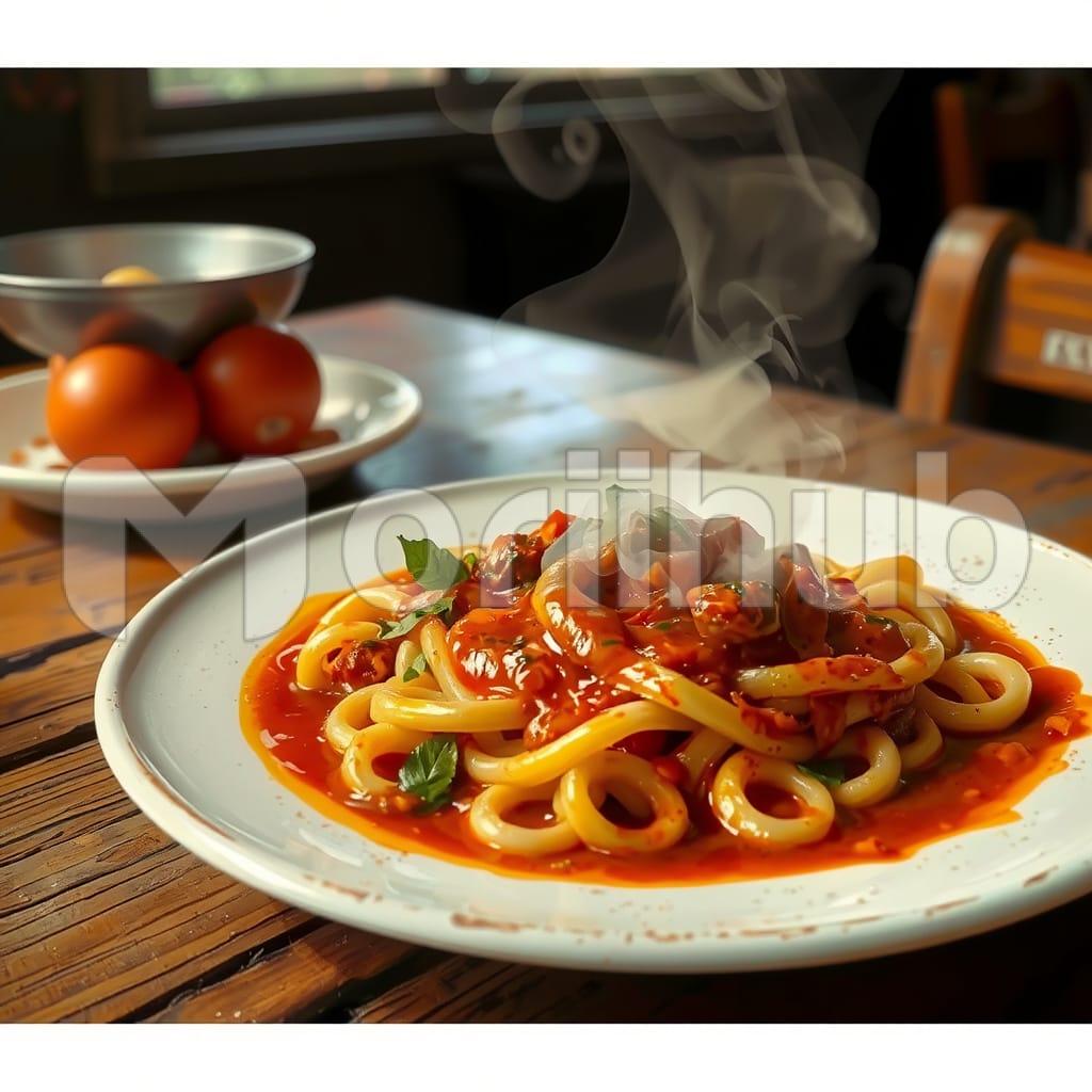 A plate of pasta rests neatly at the center, its smooth strands arranged in a modest pile. Sauce coats the top in an even layer, its surface undisturbed. The plate itself is plain, offering no distraction from the meal placed on it. Light catches along the curve of the rim, casting a faint shadow beneath. No garnish is added. The background is unembellished, allowing the focus to remain on the dish. It’s a quiet, composed view—just the pasta and sauce, nothing more. A simple scene, clearly presented without flourish.