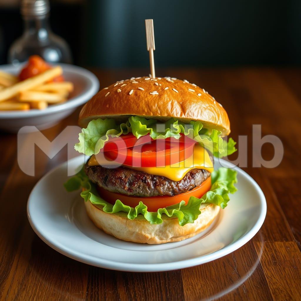 A burger rests on a plate, its layers stacked with care. The bun is rounded and soft, topped with sesame seeds that add texture and detail. Beneath it, a thick patty sits firm, surrounded by fresh lettuce and slices of tomato. A layer of melted cheese drapes gently over the meat, adding smooth texture. The plate is plain, keeping attention on the burger. Light catches the seeded bun and moist toppings, emphasizing their freshness. The arrangement feels balanced and inviting, ready to be enjoyed.