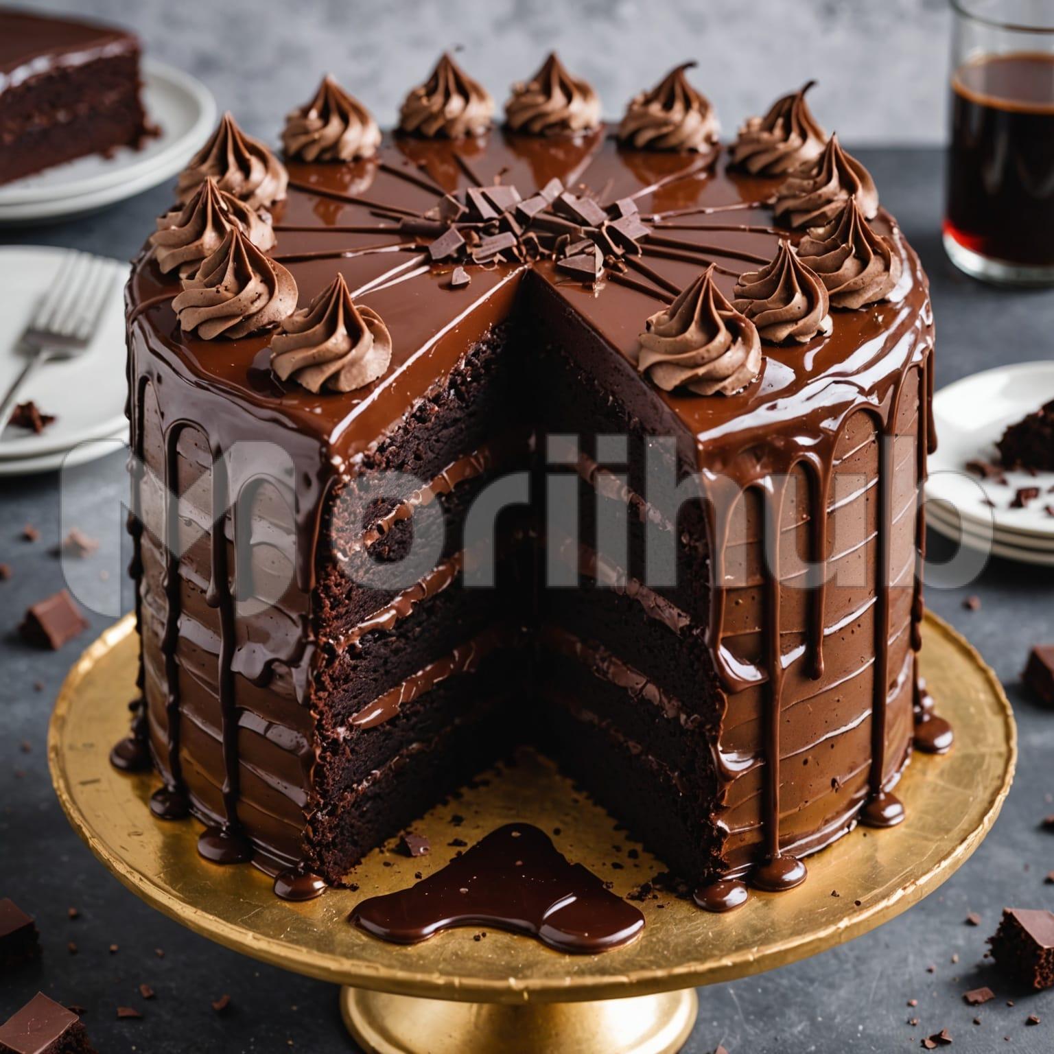 A chocolate cake sits on a plate, its rich surface smooth with a deep, even tone. A slice has been cut away, revealing soft layers within. The exposed edge is clean, showing the contrast between the outer coating and the moist interior. Crumbs rest lightly on the plate, scattered where the slice was removed. The cake remains solid, its form undisturbed except for the missing piece. Light catches the surface, hinting at a velvety texture. The plate beneath stays simple, holding the dessert in quiet presentation.