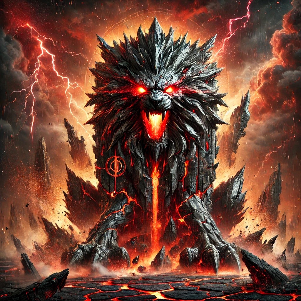 The destruction lion totem depicted here is a fearsome and powerful figure, emanating an aura of chaos and ruin. Carved from jagged, rugged stone, the totem appears fractured and scorched, as if it has survived countless battles. Fiery red and black energy pulses from its core, spilling out as flames and sparks, while symbols of destruction are etched into its rough surface. The lion’s face is contorted in a fierce roar, with blazing red eyes that seem to pierce through the smoke-filled air.