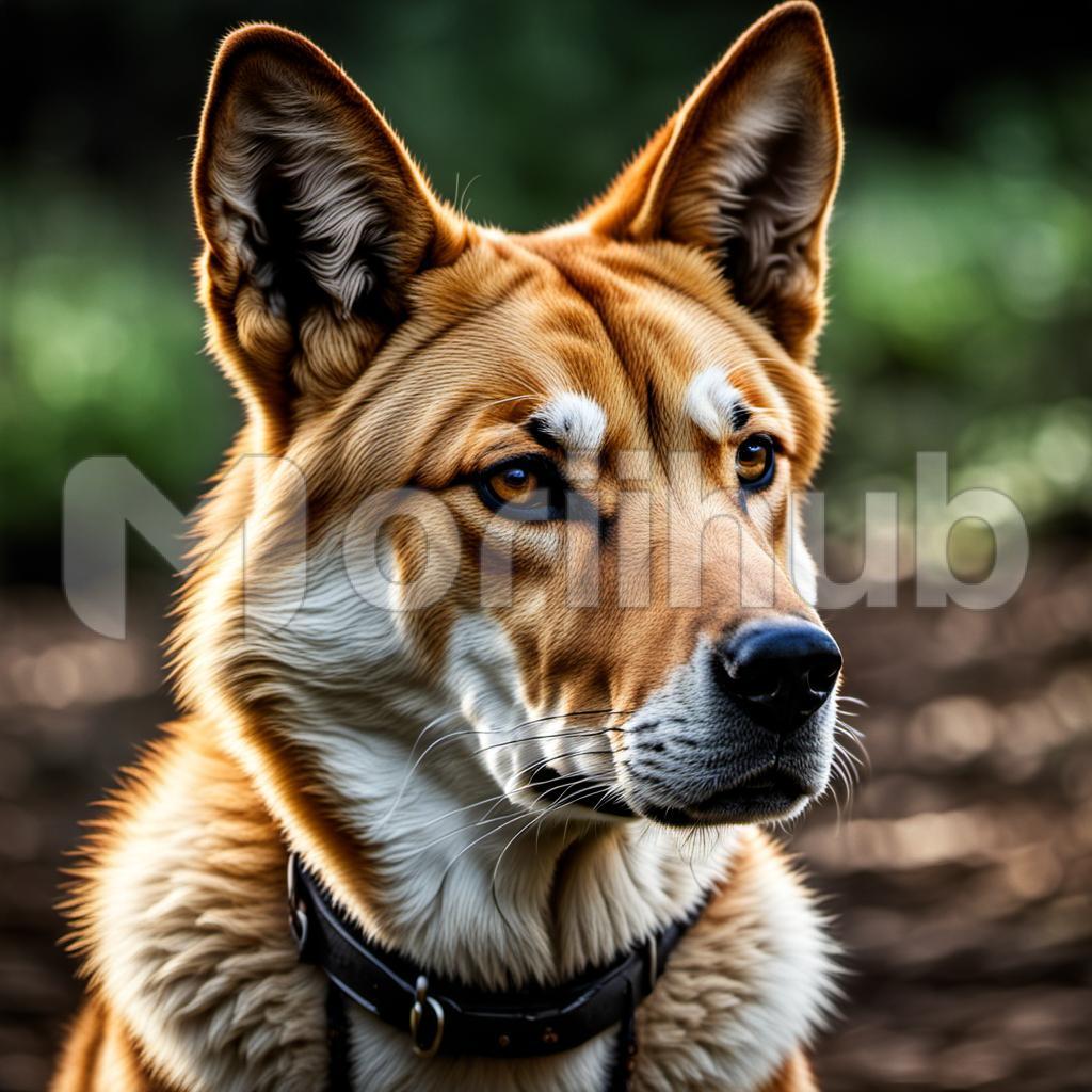A dingo sits calmly, its lean body poised with alertness. Its pointed ears stand upright, and its golden-brown coat glows under the sunlight. Its sharp eyes scan the surroundings, reflecting intelligence and curiosity. The bushy tail curls gently around its paws, completing its relaxed yet watchful demeanor.