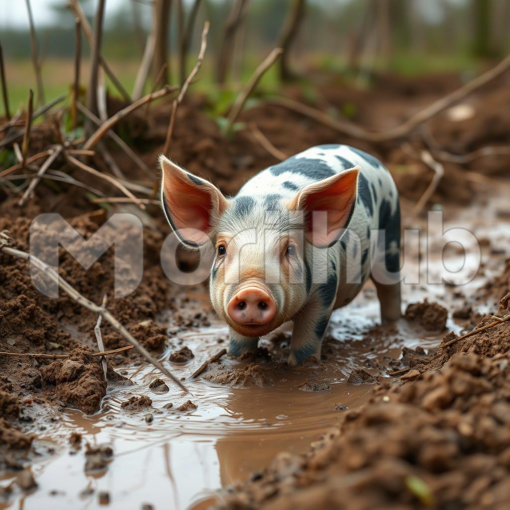 A joyful pig rolls in a muddy puddle, its body covered in dark, splattered mud. The pig’s ears flop as it splashes around, looking content and carefree. The rich brown mud contrasts with its pink skin, creating a playful scene full of dirt, laughter, and simple bliss. The pig revels in its muddy sanctuary.