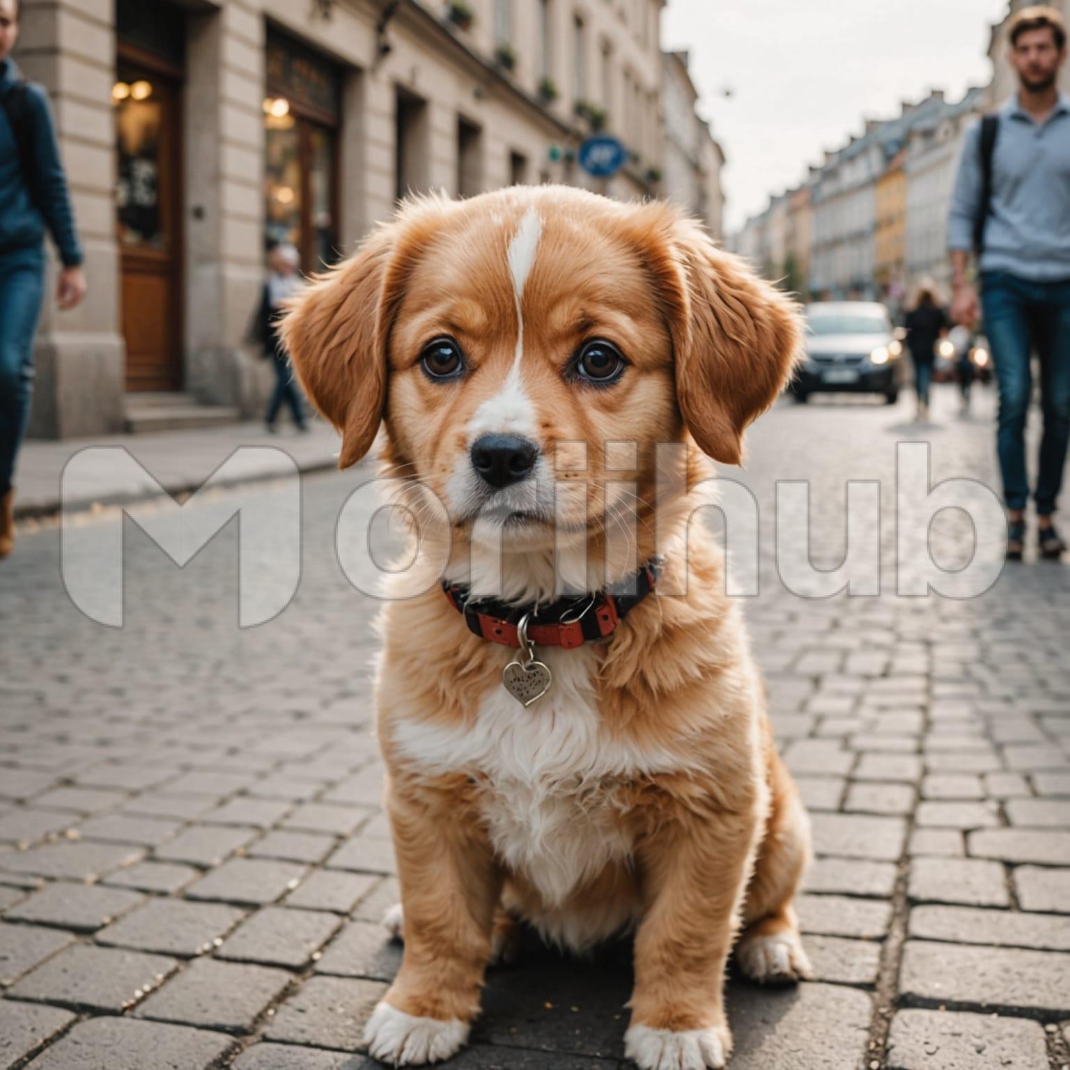 A cute dog sits quietly on the street, its body still and posture steady. Its ears hang down gently, resting close to its head in a relaxed way. The dog’s gaze remains fixed ahead, calm and observant without showing any rush or excitement. Behind, a few people walk past at a distance, their presence light and unhurried. The street stays open and simple around the dog, with no clutter nearby. The scene feels peaceful, shaped by the dog’s quiet presence and the soft, steady movement of people walking behind.