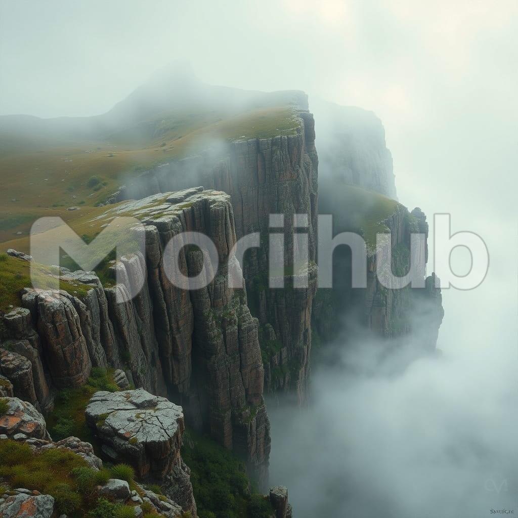 Jagged rocky cliffs rise sharply, their rough surfaces darkened by moisture. Thick, low clouds drift around the peaks, casting a muted, mysterious gloom. The scene feels wild and untamed, where sky and stone meet in a quiet, brooding embrace.