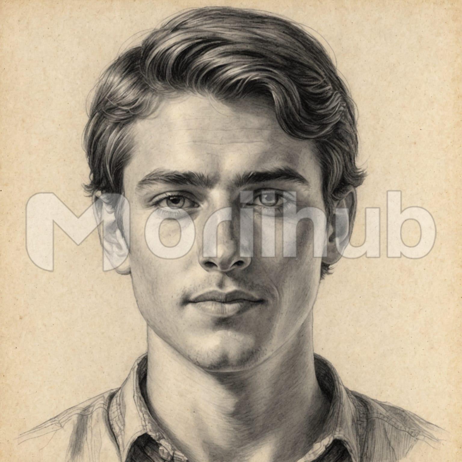 A sketch portrays a young man looking on, his gaze focused and thoughtful. The artist’s pencil strokes capture the contours of his face, with subtle shading adding depth to his expression. His eyes are drawn with a keen attention to detail, reflecting a sense of contemplation. The outline of his hair is loosely sketched, giving it a natural flow that frames his features. The simplicity of the lines and the light touch on the paper lend an air of authenticity, making the portrait feel both intimate and expressive, inviting the viewer to ponder his thoughts.