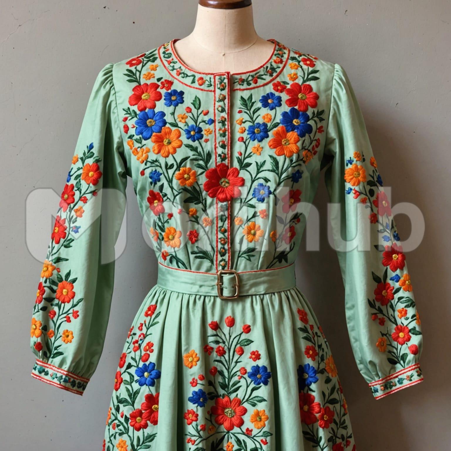 A vintage dress rests on a mannequin, its fabric adorned with soft, detailed floral prints that tell a story of timeless elegance. The colors are gentle, with delicate blooms scattered across the material in a harmonious, vintage pattern. The dress flows with a graceful silhouette, the fabric catching the light in subtle folds that enhance its charm. Its classic design exudes sophistication and nostalgia, standing as a beautiful reminder of an earlier era, evoking memories of a fashion that never fades. The dress carries both history and beauty.