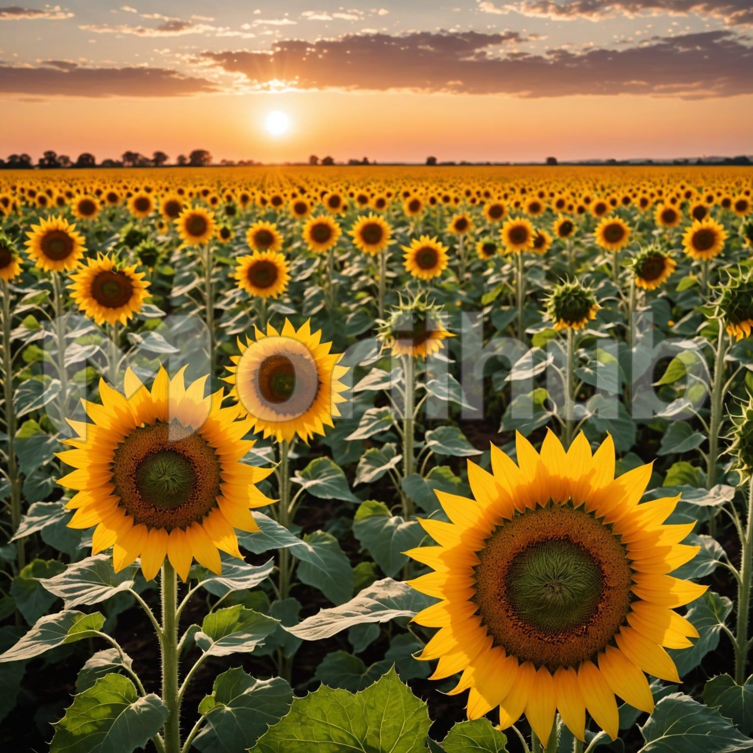 Sunset settles on the horizon, casting a warm light across the sunflower field. Each tall stem faces forward, rows of blooms standing still beneath the sky. The field stretches wide, golden heads gently bowed, their dark centers catching the soft light. Above, clouds drift in broken patterns, tinted faintly by the setting sun. The scene feels balanced—earth and sky divided by light. There’s no sound, only the steady presence of the sunflowers and the stillness of the moment. As the sun lowers, the golden field and painted clouds mark the quiet passage between day and night. Everything holds still.