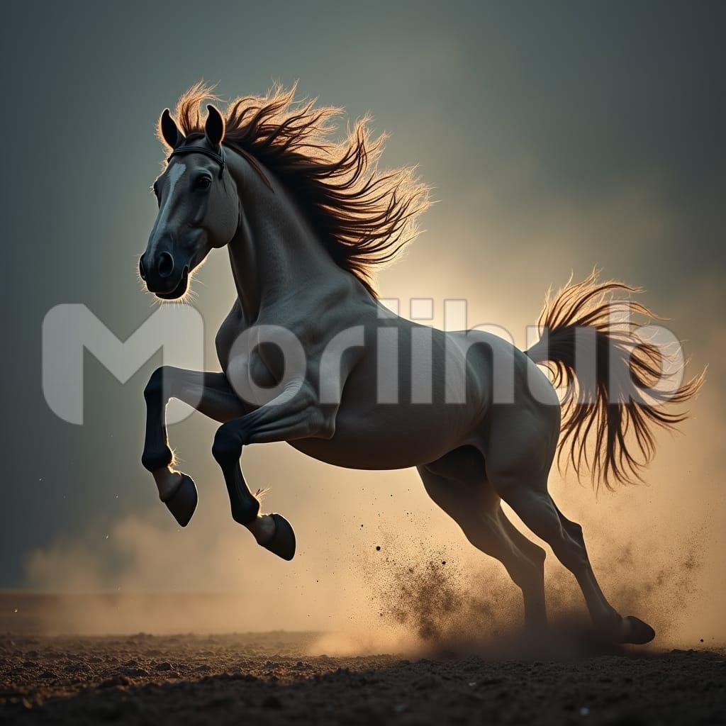 A powerful and majestic horse captured mid-jump, muscles tense and mane flowing. The horse exudes grace and strength, soaring over the obstacle with precision.