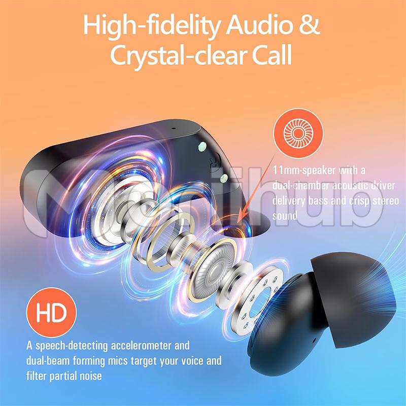 Immersive Stereo Sound & Crystal Clear Calls: Wireless headphones features an 11mm speaker with dual-chamber acoustic drivers for bass and crisp stereo sound that will immerse you in your music and give you a private concert listening experience. The headphones wireless bluetooth’ built-in dual beam forming microphone target your voice and filter partial noise, allowing you to capture every word of the call and have a great conversation without taking the earbuds wireless bluetooth off.