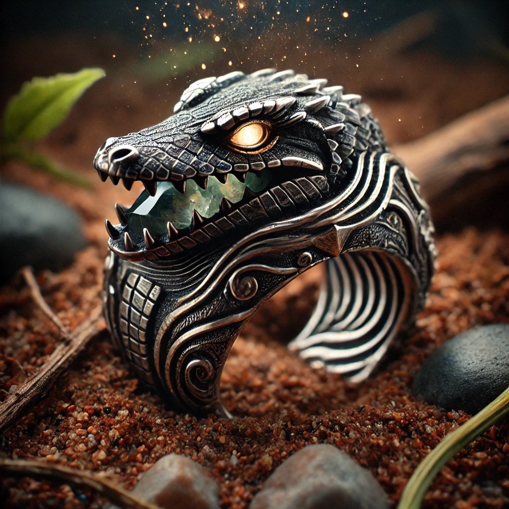 A mystical ring with a gemstone shaped like a crocodile’s head, crafted from stones and earth. The crocodile’s eyes glow fiercely, symbolizing danger and resilience. The band is intricately engraved with sharp scales and river patterns, representing stealth and power. A subtle aura of leaves and soil swirls around the ring, as if the crocodile’s spirit is alive, lurking through the wilderness.