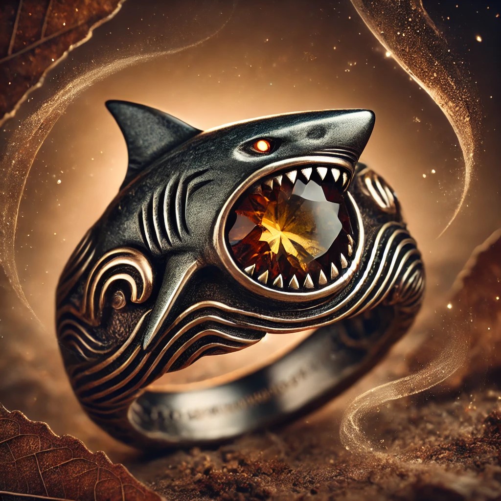 A mystical ring with a gemstone shaped like a shark’s head, crafted from stones and earth. The shark’s eyes glow fiercely, symbolizing danger and dominance. The band is intricately engraved with sharp fin and wave patterns, representing power and stealth. A subtle aura of leaves and soil swirls around the ring, as if the shark’s spirit is alive, moving swiftly through the wilderness.