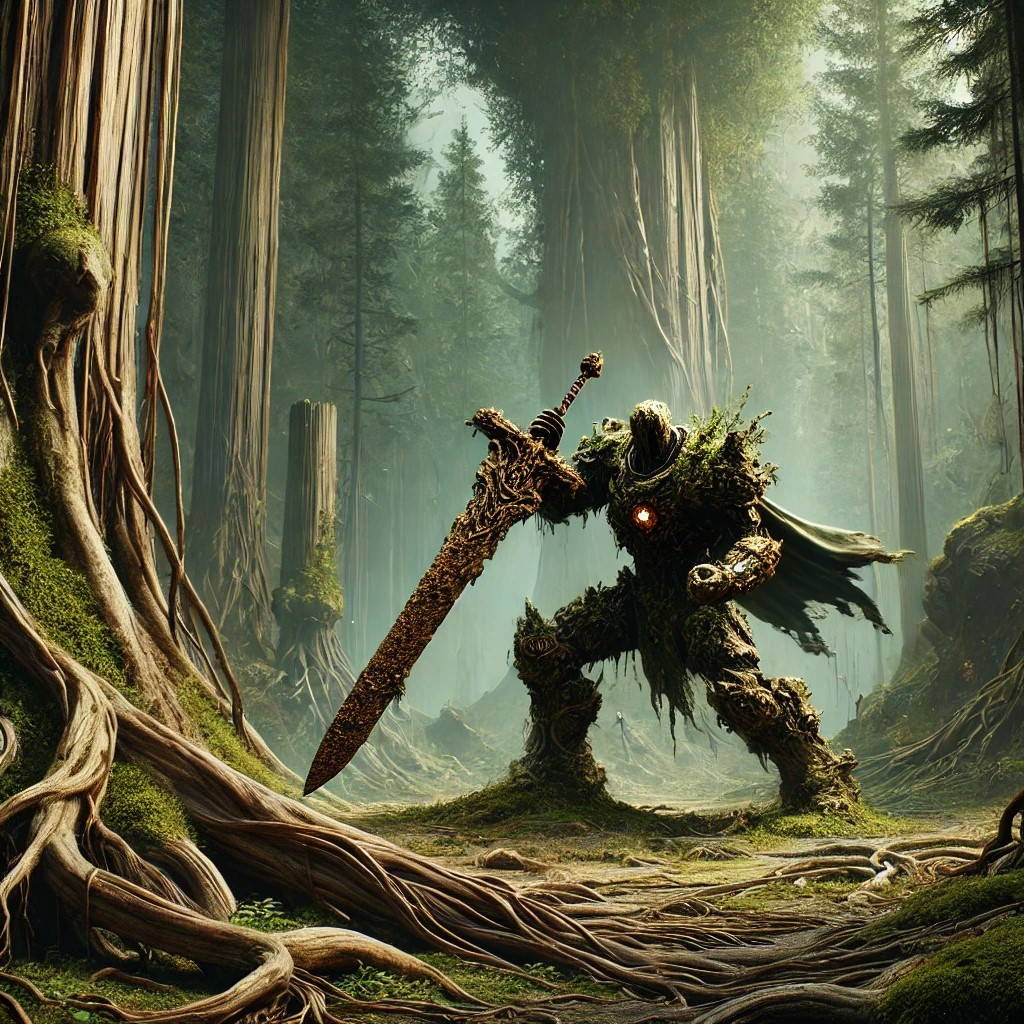 Immortal warrior wielding a sword made of earth, standing in a dense, ancient forest. The earth sword is thick and intertwined with roots and rocks, radiating a deep, natural energy. The warrior’s armor resembles elements of tree bark, stone, and vines, blending seamlessly with the forest. Towering ancient trees, roots weaving through the ground, and glowing plants in the background create a serene yet powerful atmosphere. The earth sword’s energy causes the ground to crack and roots to emerge beneath the warrior’s feet.