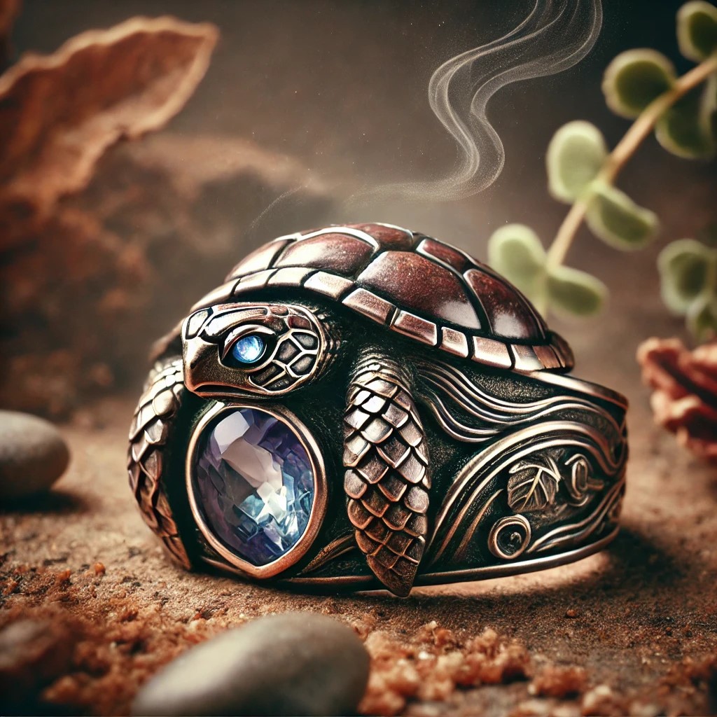 A mystical ring with a gemstone shaped like a turtle’s head and shell, crafted from stones and earth. The turtle’s eyes glow softly, symbolizing wisdom and strength. The band is intricately engraved with flowing water and leaf patterns, representing endurance and protection. A subtle aura of leaves and soil swirls around the ring, as if the turtle’s spirit is alive, slowly moving through the wilderness.