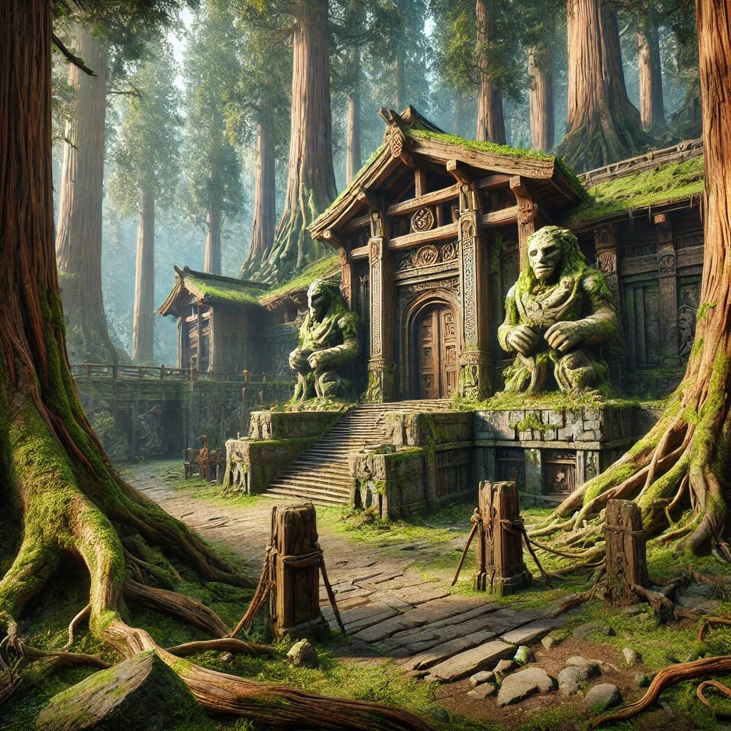The Earth Warrior Academy is nestled within a dense, ancient forest, with towering trees and thick undergrowth surrounding it. The academy is constructed from sturdy stone and wood, with walls that are partially covered in moss and vines, giving it a timeless, natural appearance. The structure blends seamlessly with the environment, with large roots and boulders integrated into its design. The entrance is a massive wooden gate, flanked by stone statues of ancient warriors, their forms intertwined with roots and earth.