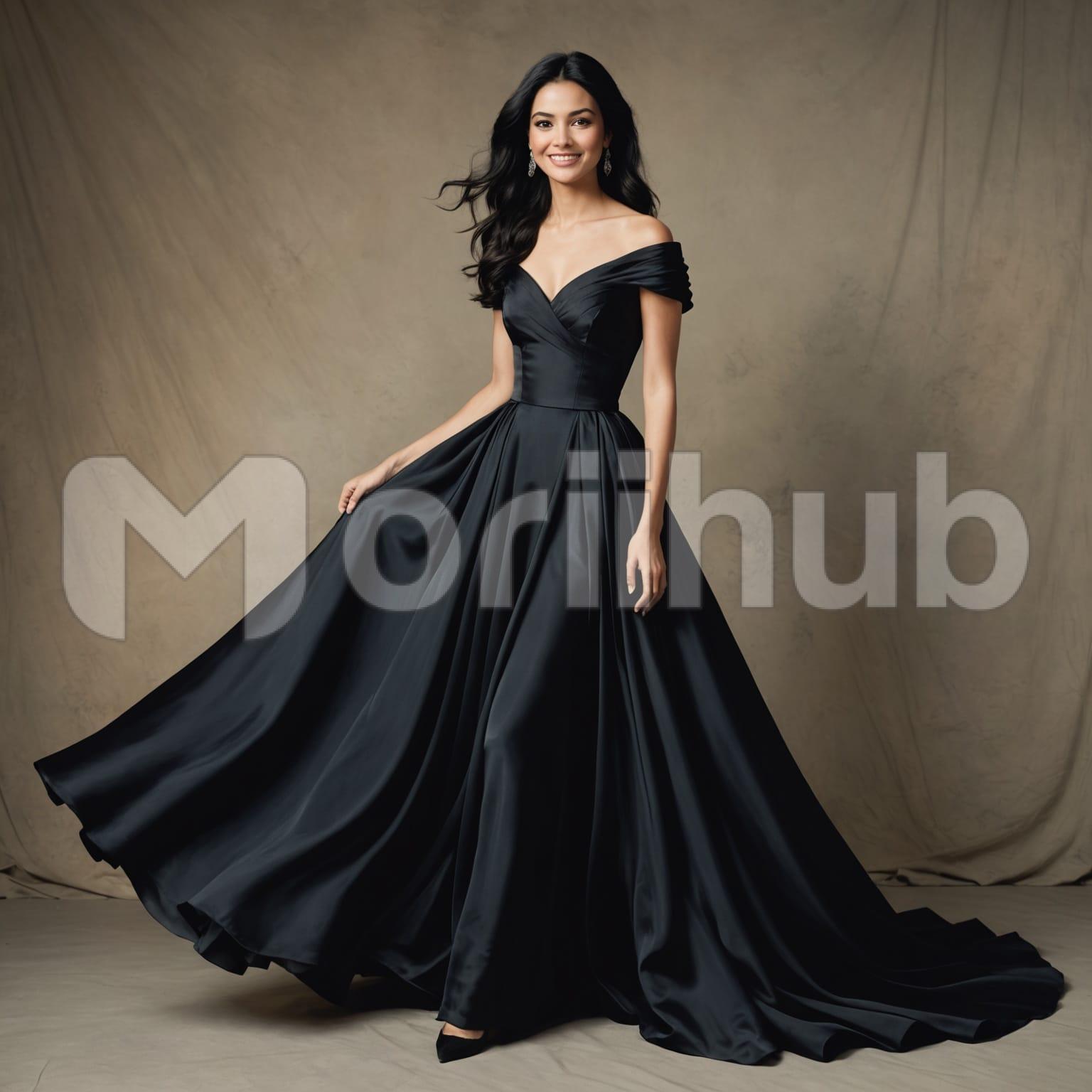 A beautiful woman stands gracefully, her gaze fixed ahead with a quiet intensity. She dons a black gown that flows elegantly around her, the fabric hugging her figure before cascading to the floor. The gown’s simple yet sophisticated design complements her poise, adding to her effortless elegance. Her hair is styled softly, framing her face as she looks on with calm determination. The scene radiates an aura of timeless beauty, where strength and grace intertwine, leaving a lasting impression of both serenity and confidence.
