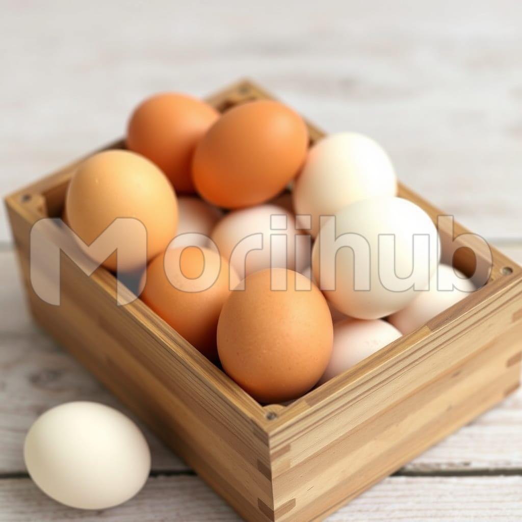 A wooden box holds several eggs arranged closely within its frame, their smooth surfaces resting in quiet simplicity. The box itself, sturdy and plain, contrasts with the delicate appearance of what it contains. Just beside the box, a single egg sits apart, creating a gentle break in the arrangement and drawing subtle focus. The separation highlights balance between the grouped and the solitary. The wooden surface beneath grounds the scene, adding texture and context. The overall setting feels calm, orderly, and understated, emphasizing the quiet presence of the eggs.