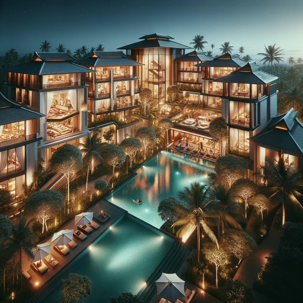 At night, the luxurious resort becomes a beacon of elegance and sophistication, adorned with graceful lighting that bathes its surroundings in a warm, inviting glow. Modern architecture seamlessly blends with nature, creating a harmonious ambiance that enchants guests. The tranquil atmosphere evokes a sense of serenity, offering a haven for relaxation and indulgence amidst luxurious amenities and stunning surroundings.