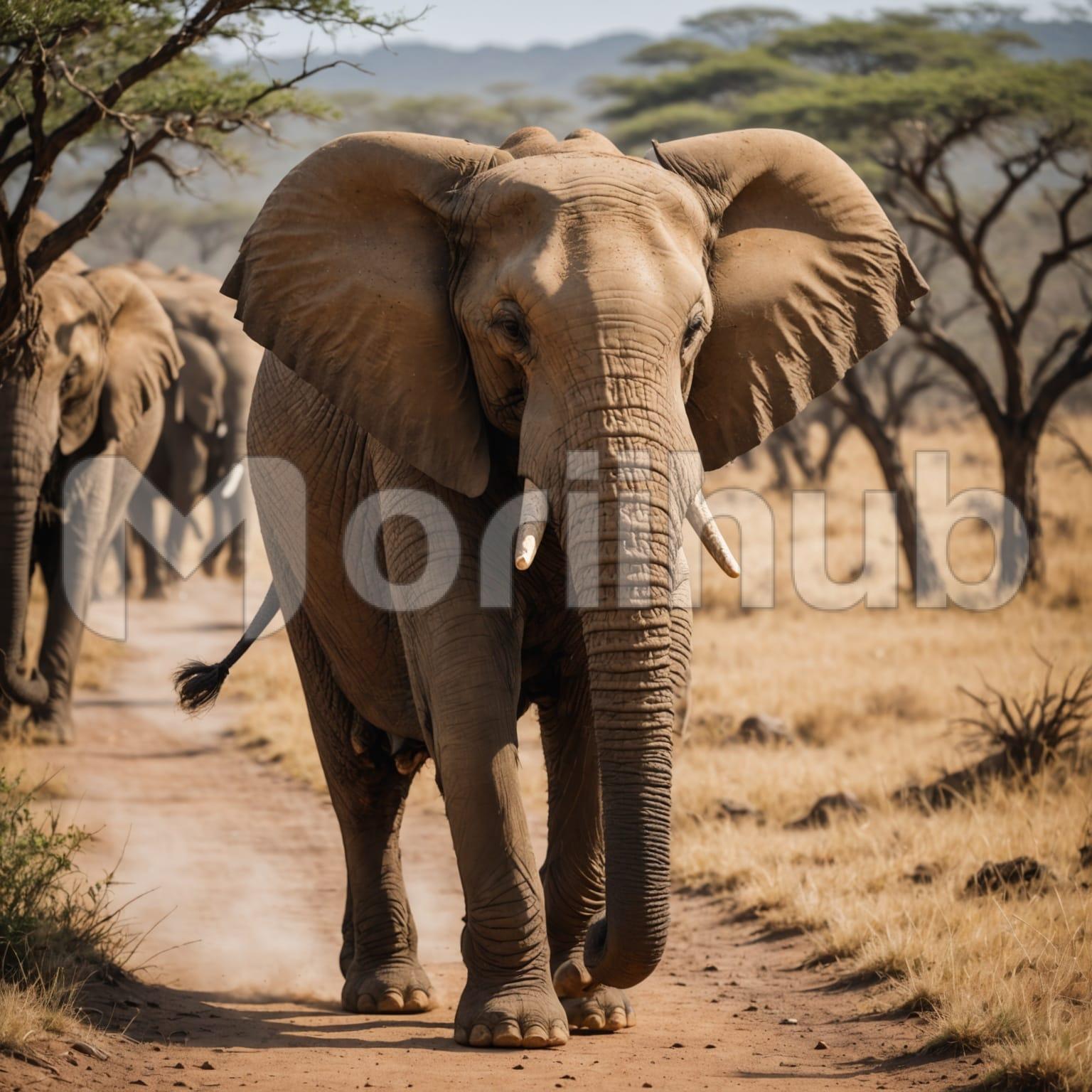 An elephant walks steadily, its powerful form moving with a gentle rhythm. Its ears sway with each step, and its trunk lightly brushes the ground, a picture of grace and strength. Behind it, other elephants follow, their movements synchronized as they traverse the terrain. The scene captures a sense of unity and purpose, the elephants moving together as a cohesive group. Their presence evokes a feeling of wonder, showcasing the beauty of these majestic creatures and their harmonious connection to the world around them.