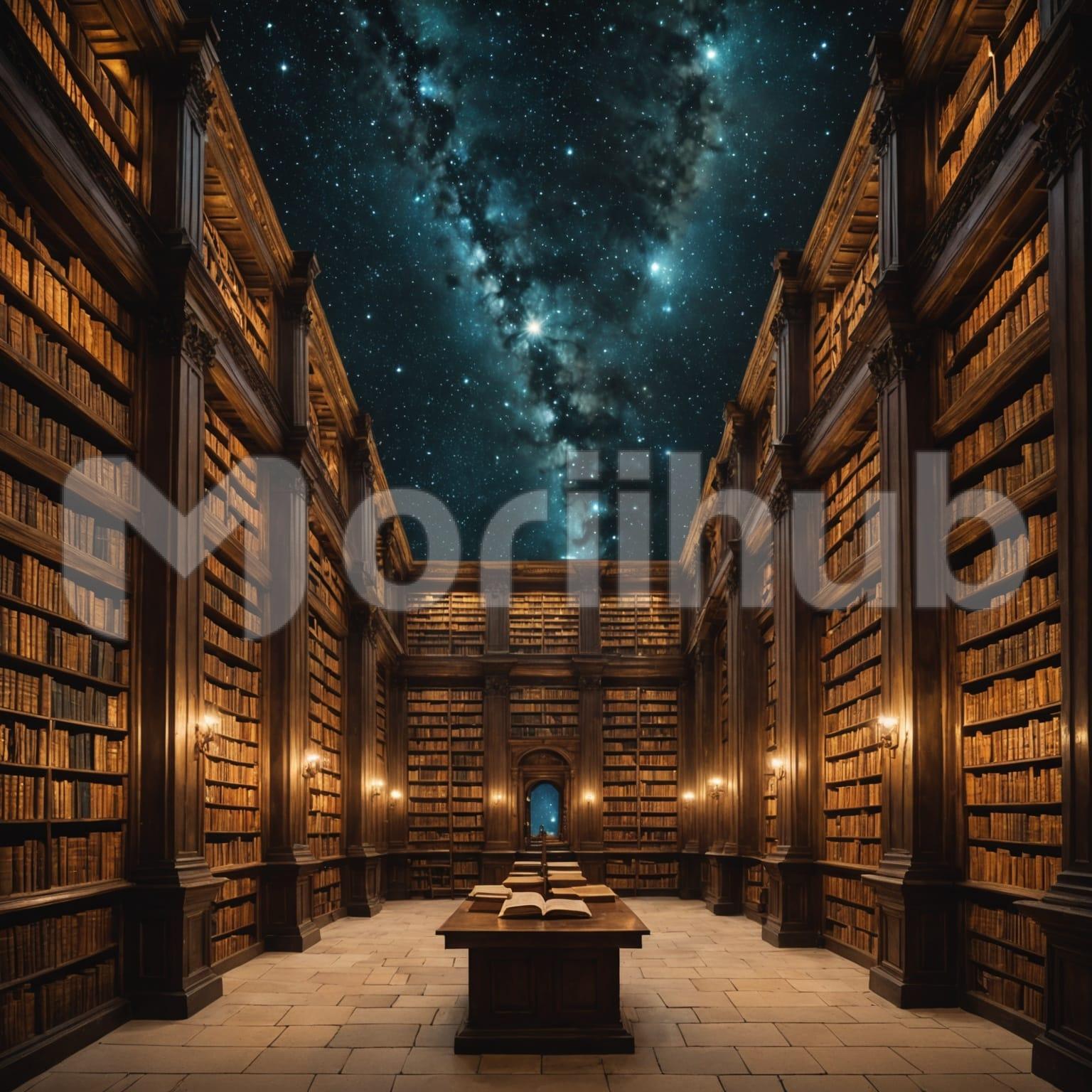A library stretches into a starlit void, its towering bookshelves reaching endlessly into the darkness. Ancient tomes float freely, suspended in the air, their pages turning as if guided by an unseen hand. The atmosphere hums with quiet mystery, a place where knowledge transcends time.