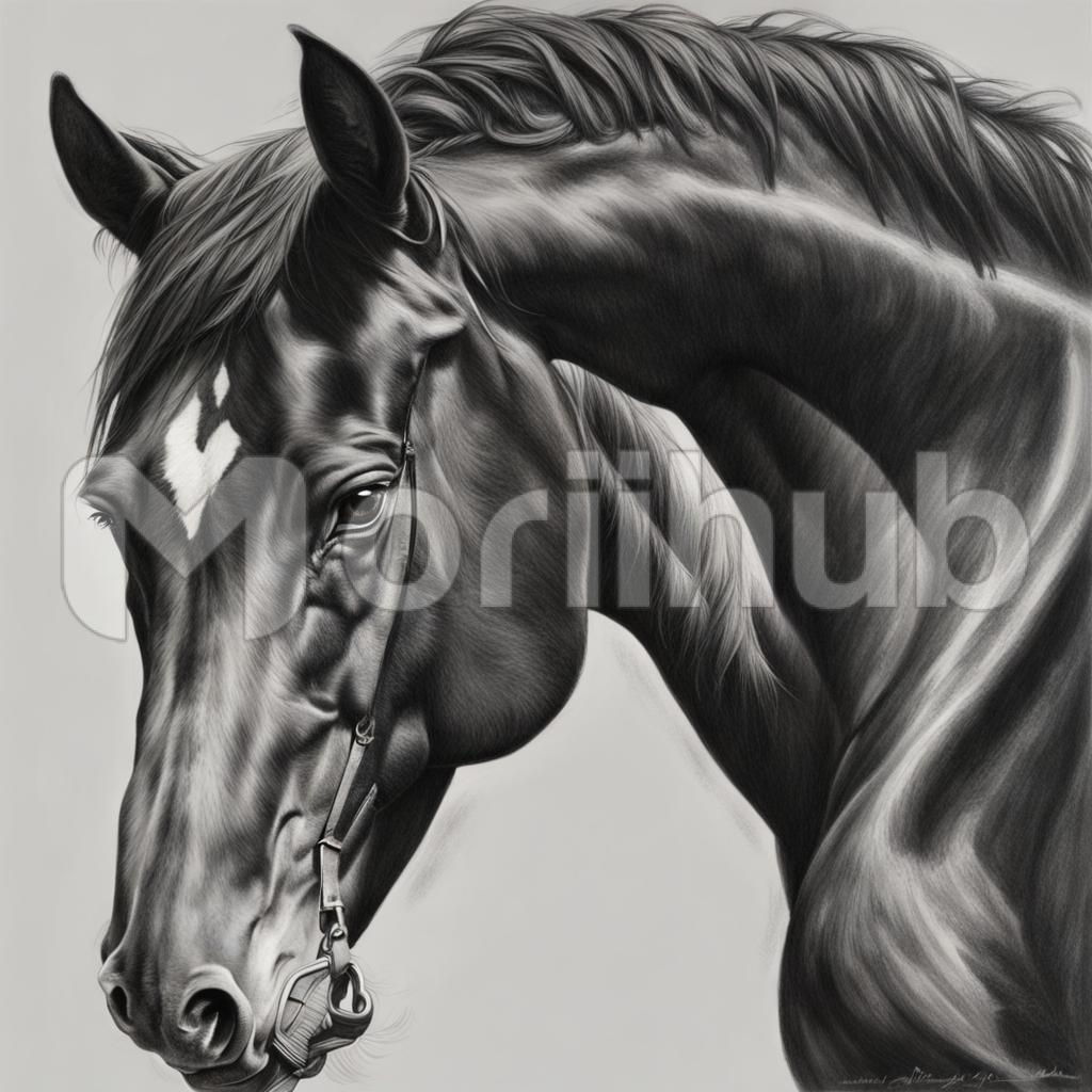 A striking pencil drawing adorns the canvas, capturing the essence of a black horse’s head in meticulous detail. The monochromatic masterpiece brings the equine form to life with graceful lines and shading. The majestic creature’s profile emerges, highlighting the power and elegance inherent in every stroke. The stark contrast against the white canvas amplifies the intensity, creating a timeless portrayal of strength and beauty in the delicate medium of pencil on canvas.