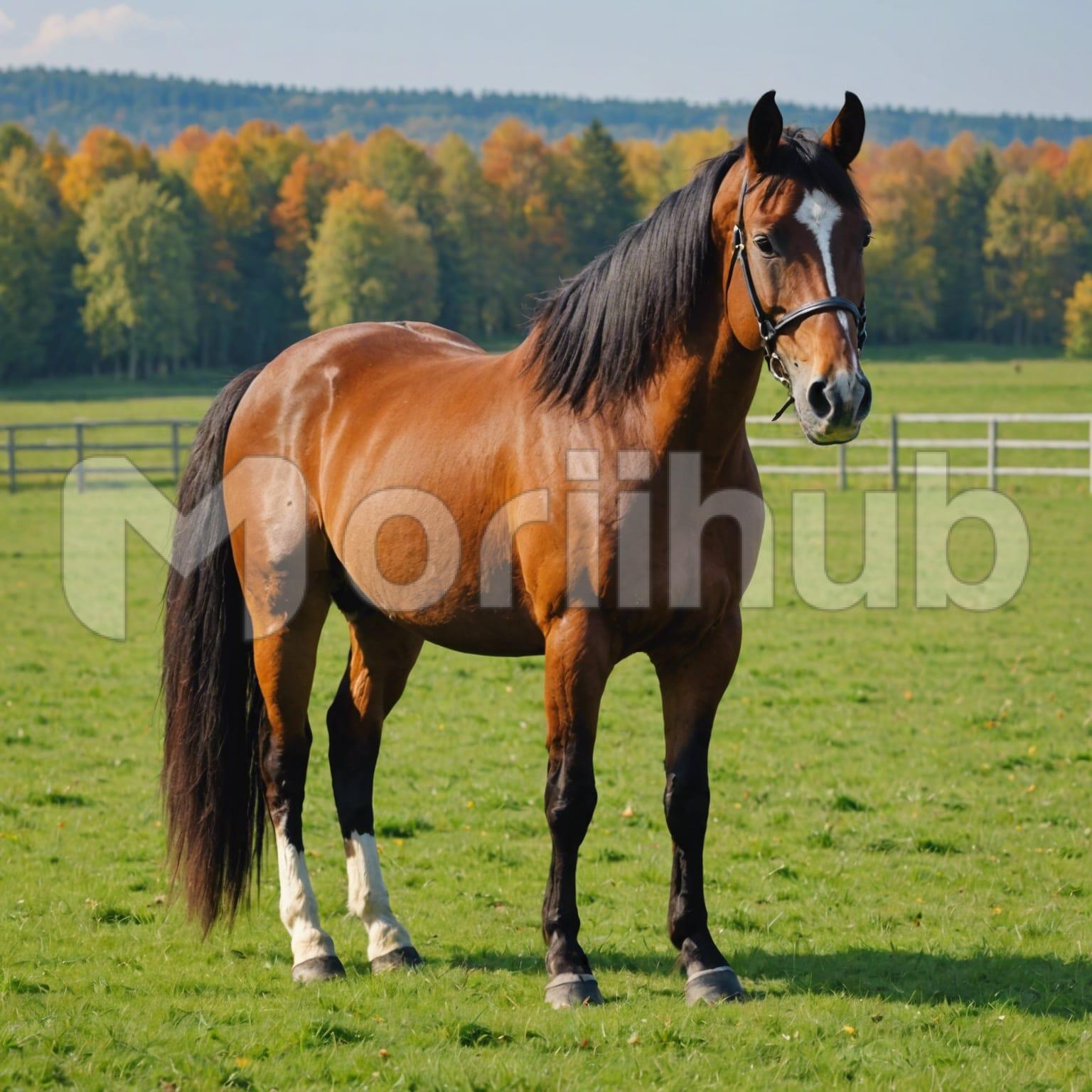 A horse stands gracefully in the middle of a lush, green field, its sleek coat gleaming under the warm sunlight. Its mane flows gently in the breeze, adding to its majestic presence. The horse’s eyes, deep and calm, observe the surroundings with a serene curiosity. Muscles ripple beneath its smooth skin, showing strength and vitality. Its tail swishes lazily, warding off the occasional fly. The scene is peaceful, capturing the essence of freedom and natural beauty, with the horse embodying a timeless elegance against the verdant backdrop.