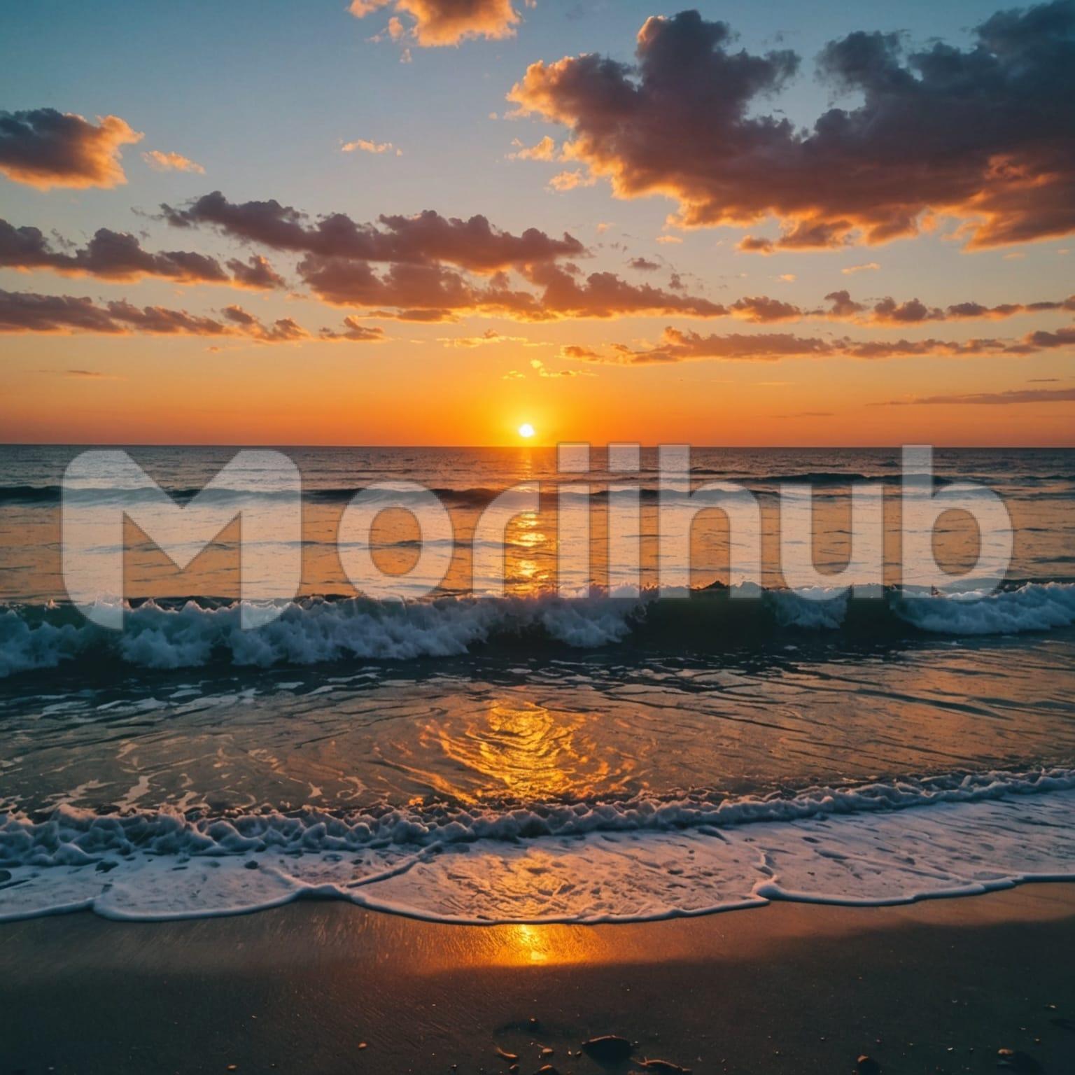 The sun lowers toward the horizon, casting a soft light over the sea. Clouds stretch across the sky in uneven shapes, touched gently by the fading glow. The water below moves with calm waves, rising and falling in a slow, steady rhythm. Reflections shimmer lightly on the surface, shifting as the waves pass. No strong contrast appears—just a smooth blend of sky and sea. The scene feels quiet and even, shaped by distance and the soft presence of light, cloud, and water working together in balance as the day closes.
