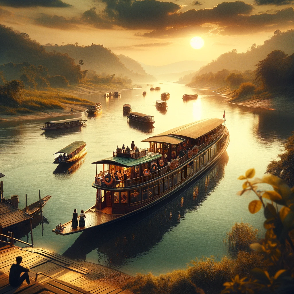 As the sun dips toward the horizon, its soft golden rays dance upon the tranquil waters of the river, painting the sky with hues of pink and orange. The gentle breeze whispers through the air, carrying the scent of nearby blossoms. Onboard the boat, passengers are enveloped in a serene atmosphere, basking in the beauty of nature’s evening symphony.