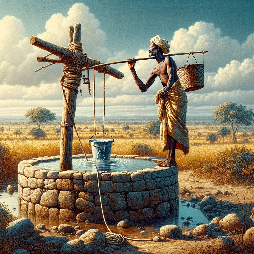 In the vast expanse of an arid African landscape, an African man, dressed in earth-toned attire, diligently fetches water from a well. The backdrop reveals a stark and open terrain with sparse vegetation, reflecting the challenging yet enduring daily life in this rural setting. The man’s resilience mirrors the unforgiving beauty of the land, highlighting the vital connection between human existence and the African wilderness.