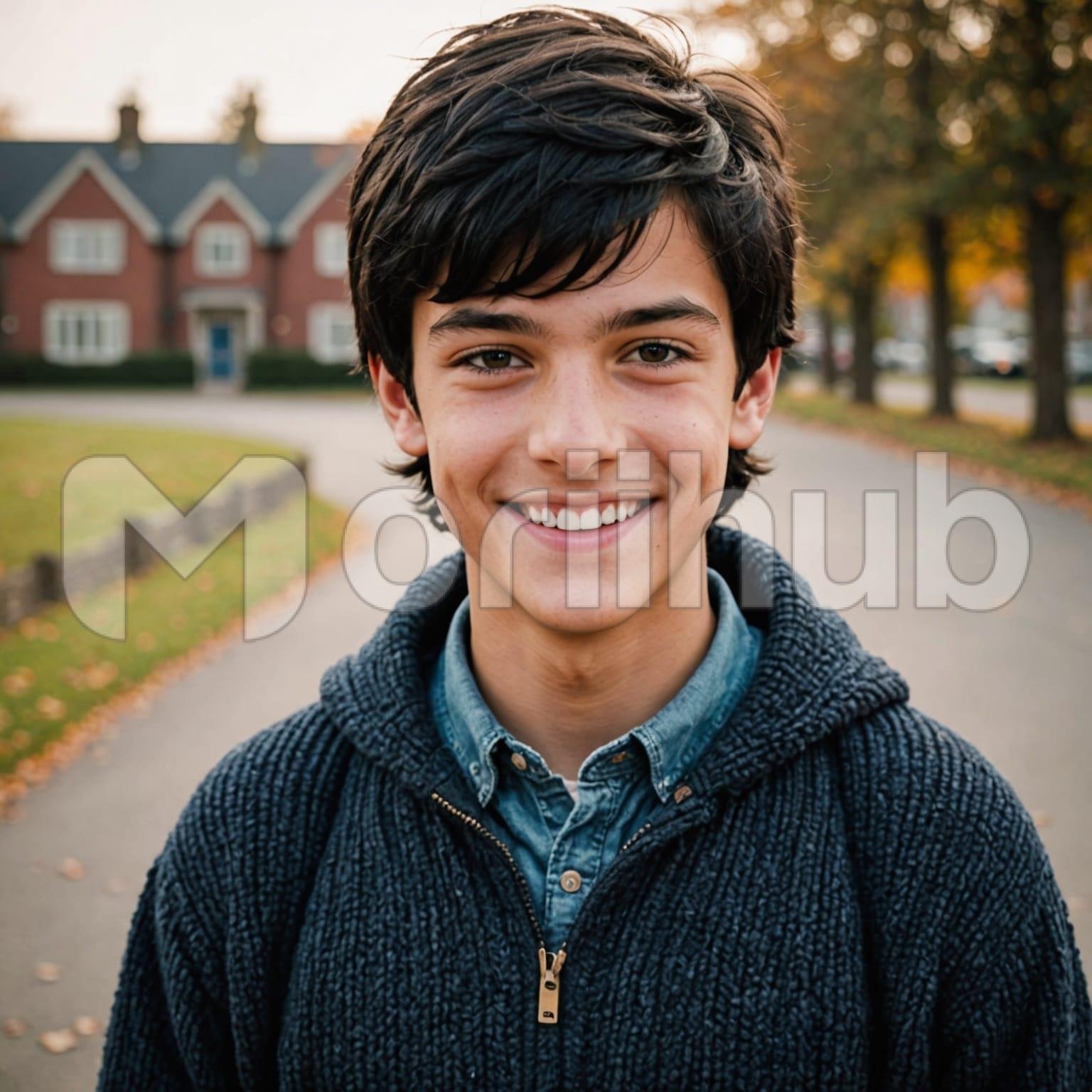 A teenage boy looks ahead, his expression calm, a smile resting on his face. His short hair is neatly kept, framing youthful features. He dons a knitted sweater, its texture visible in the soft folds of fabric. The sweater fits comfortably, its sleeves resting naturally. His posture is relaxed, shoulders slightly eased. His gaze is steady, carrying a quiet confidence. The background remains plain, ensuring focus stays on him. The simplicity of the scene highlights his warmth, an effortless presence captured in a still moment.