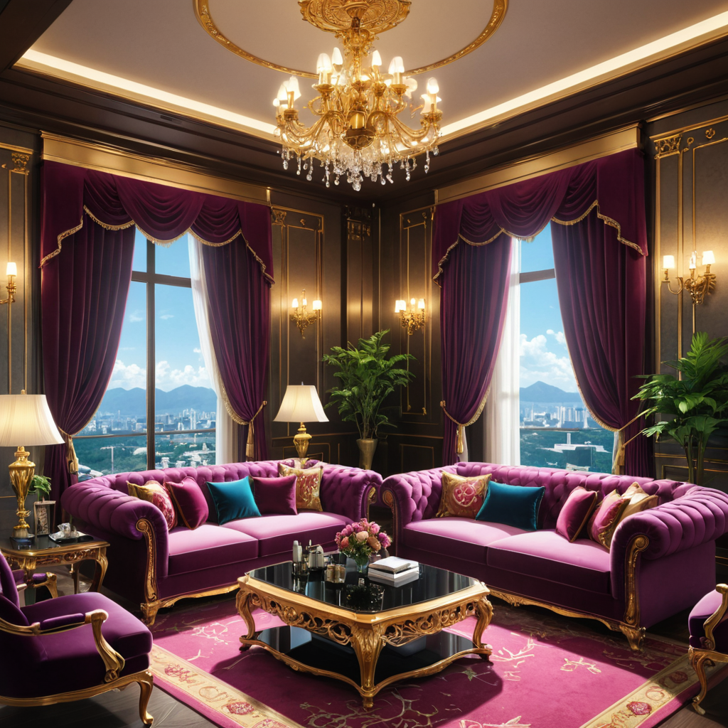 Within the opulent space of a luxurious living room, a grand chandelier casts a warm glow, illuminating the lavish scene below. Plush couches beckon invitingly, their rich upholstery hinting at comfort and elegance. At the center, a gleaming coffee table serves as a focal point, adorned with tasteful décor. Together, these elements create an ambiance of refined sophistication, inviting relaxation and conversation in the embrace of sumptuous surroundings.