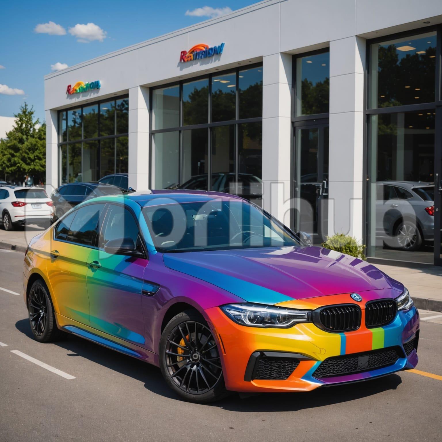 A sleek, modern car with a stunning rainbow-colored finish shines under the city lights. Its futuristic design, smooth curves, and vibrant hues turn every head on the road. Speed meets style in this eye-catching ride, blending technology and art into a masterpiece on wheels. A true showstopper!