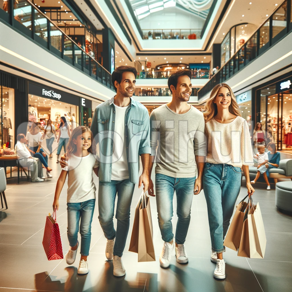 A vibrant family outing unfolds at a bustling shopping mall. Two adults and two children, dressed casually, immerse themselves in the retail therapy experience. Their smiles reflect the joy of shared moments as they stroll, explore stores, and make purchases, with shopping bags in hand. Laughter and excitement fill the air, creating cherished memories in the heart of the mall’s lively ambiance.
