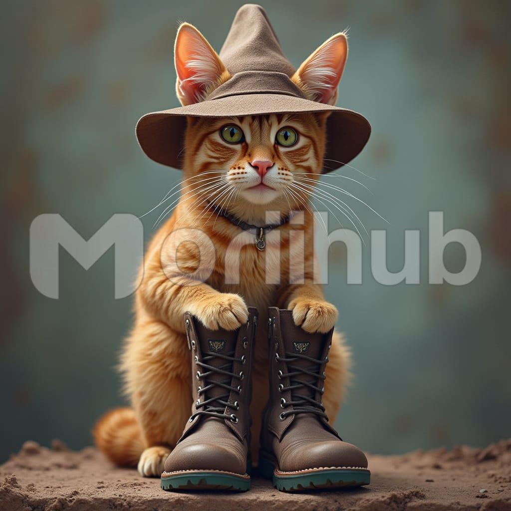 A big cat struts confidently, rocking a stylish hat and boots. Its fur gleams in the light, and its boots give a playful yet fashionable touch. The hat adds a touch of sophistication, making the cat the star of the street with its bold, unique fashion sense.