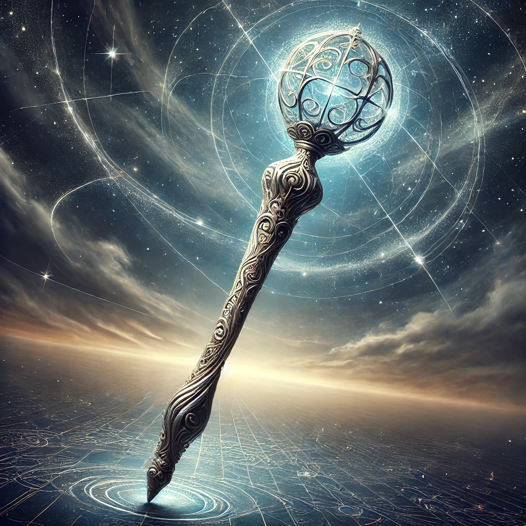 The wand is crafted from an ancient, silvery material that seems to shimmer with the threads of destiny. Its surface is smooth, with intricate, interwoven patterns that resemble delicate threads or the lines on a palm, symbolizing the interconnected paths of fate. The wand is slender and elegant, with a subtle, ethereal glow that shifts colors—sometimes silver, sometimes gold, sometimes a deep, mysterious blue.