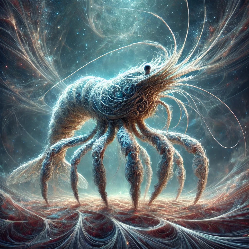 Fate shrimp, embodying the threads of destiny, standing in a mystical, ethereal realm. Its lower body is shrimp-like but appears to be woven from countless shimmering threads that twist and intertwine, symbolizing the complex weave of fate. The upper half is humanoid, with arms that resemble delicate, flowing strands of light, each one representing a different path or outcome. The shrimp’s exoskeleton glows with a silvery-blue hue, covered in intricate, labyrinth-like patterns that shift and change as if the very fabric of destiny is in motion.