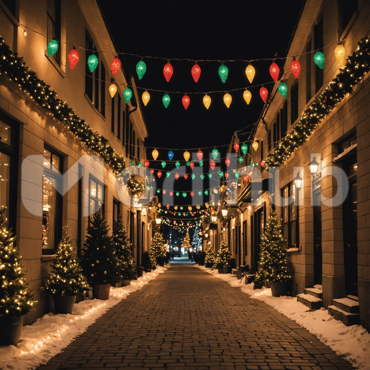 A charming street glows under festive Christmas lights, with trees, rooftops, and lampposts wrapped in warm, twinkling strands. The soft illumination reflects on the pavement, creating a cozy, magical atmosphere that feels both cheerful and timeless.