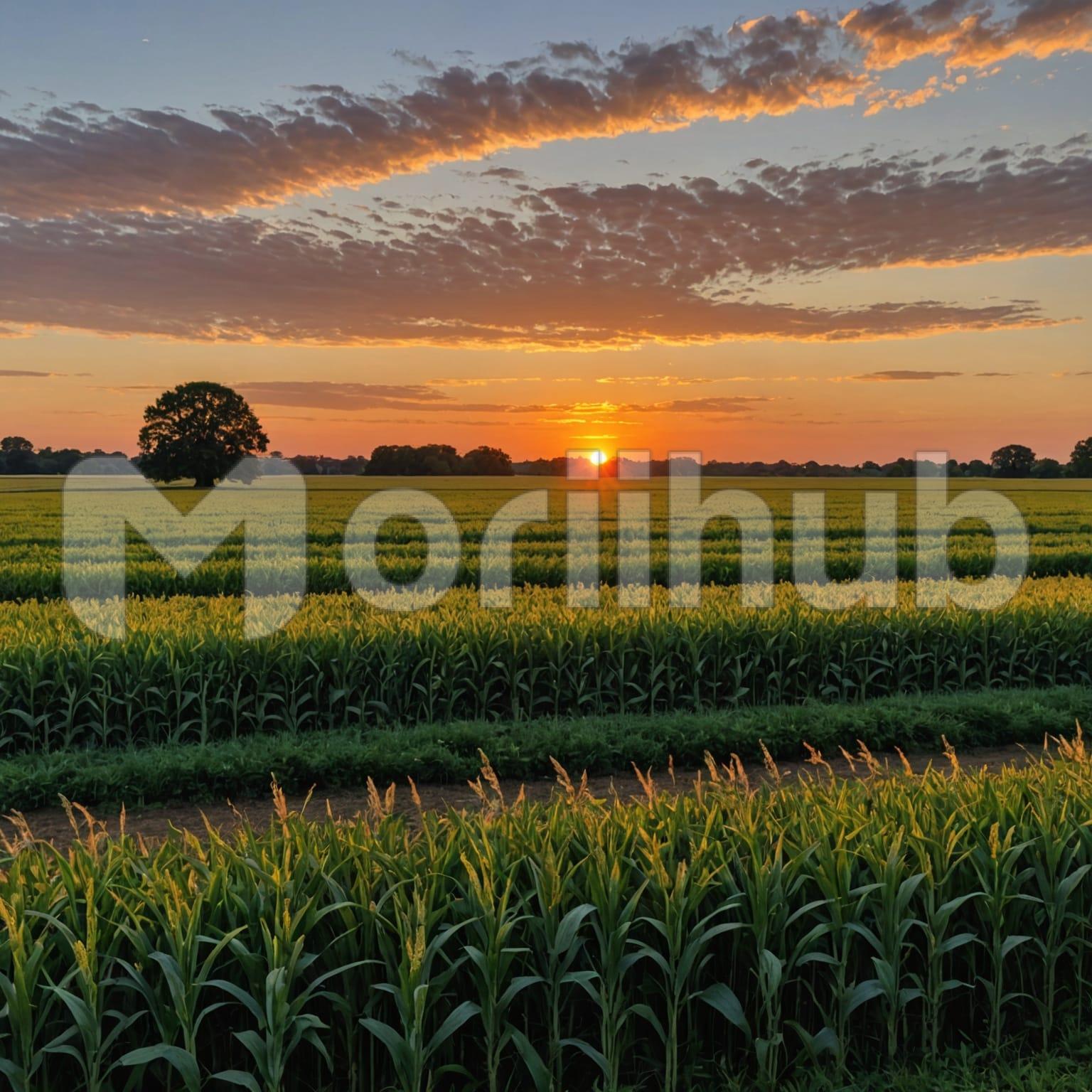 As the sun sets on the horizon, it casts a warm glow over the expansive cornfield, transforming the landscape into a peaceful scene. The tall stalks sway gently in the evening breeze, creating a rhythmic rustle that complements the tranquil atmosphere. Wisps of clouds drift lazily across the sky, adding depth to the view. The fading light bathes the field in a serene warmth, inviting a sense of calm and reflection as day gracefully turns to night.