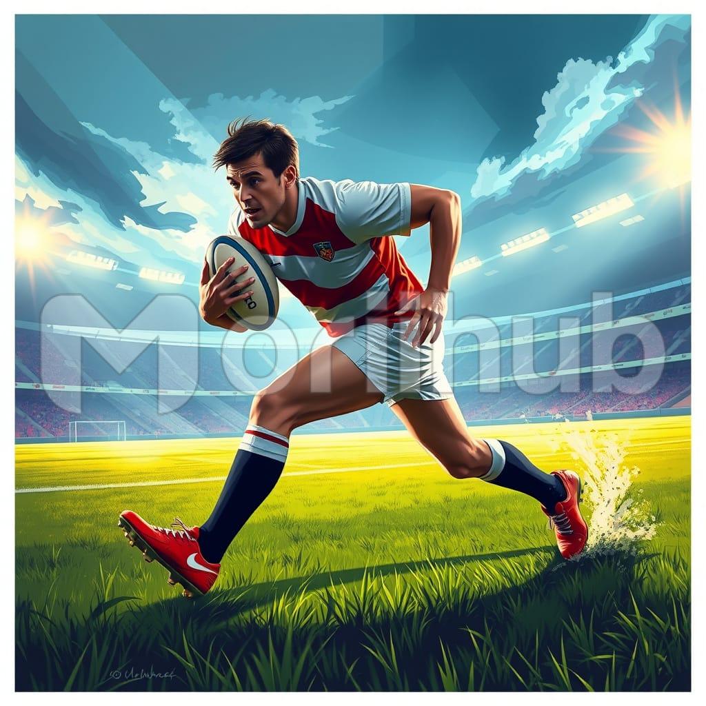 On the open pitch, a rugby player charges forward, always on the run, dodging tackles with fierce determination. His energy electrifies the field, a blur of strength, speed, and unstoppable will.