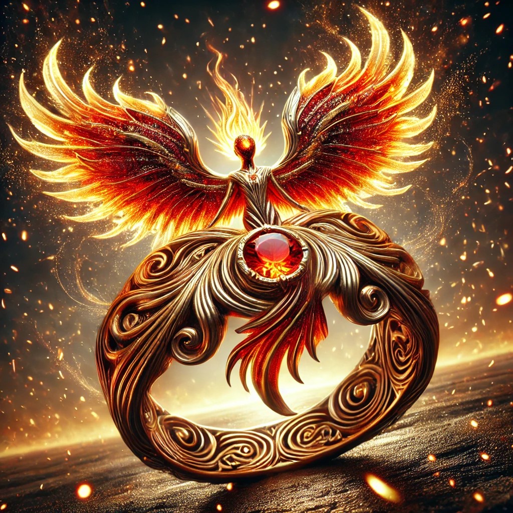 The fire angel ring is a majestic and radiant piece, crafted from molten gold or fiery bronze. The band is shaped like flowing flames and celestial patterns, symbolizing divine power and energy. At the center is a fiery angel, its wings spread wide and ablaze with vibrant red, orange, and golden hues. The wings are detailed with flame-like patterns, as if made of living fire.