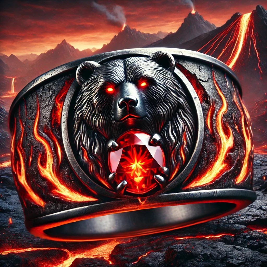 The fire bear ring is a bold, sturdy piece forged from dark iron or volcanic rock. The thick band has cracks glowing with molten fire, giving the appearance of searing heat trapped within. Flames are intricately engraved along the sides, merging into the fierce face of a bear at the center. The bear’s eyes glow like hot coals, while its fur appears as rippling flames. A large, fiery red gemstone is set prominently in the bear’s chest or forehead, radiating raw, primal energy.