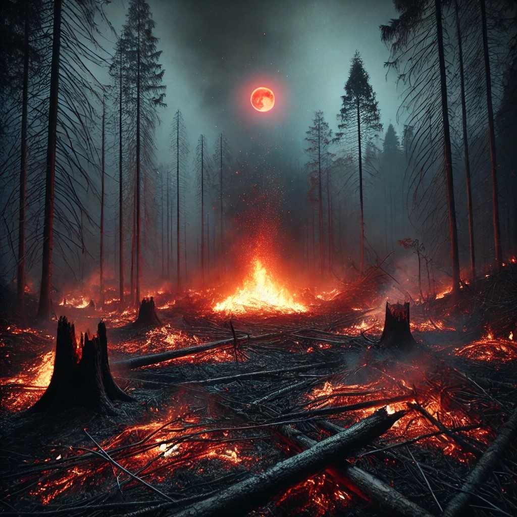 A fiery clearing within a dark, dense forest. At the center of the clearing, a large, roaring fire blazes, casting an intense, orange glow across the surroundings. The ground is blackened and scorched, covered in glowing embers and ash, with charred tree stumps scattered around. The surrounding trees are twisted and blackened, their branches reaching out like skeletal fingers, adding to the ominous atmosphere.
