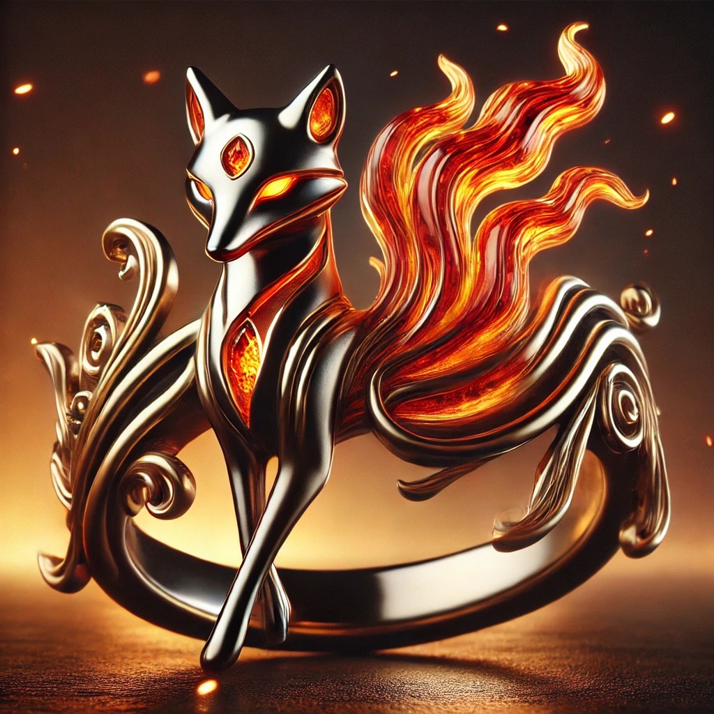 The fire fox ring is a sleek and elegant piece, crafted from molten gold or fiery bronze. The band is shaped like flowing flames, with intricate flame designs weaving along the sides. At the center is the agile form of a fox, its tail ablaze and swirling around the band in fiery tendrils. The fox’s eyes glow with sharp, fiery intensity, embodying its cunning and intelligence.