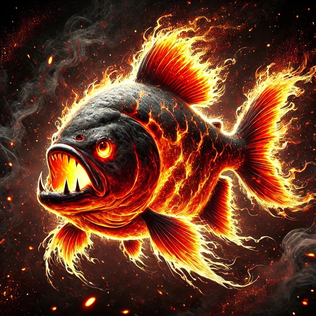 A fierce, fiery scene featuring a fire piranha that embodies the power of flames. The piranha has scales that glow with intense shades of red, orange, and yellow, resembling molten lava. Its sharp teeth gleam as it swims through a dark, smoky environment, with flames flickering around its body. The piranha’s fins and tail trail behind it like fiery wisps, leaving a path of glowing embers in the water.