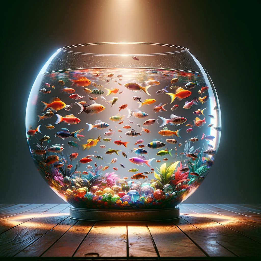 In the captivating fishbowl, a kaleidoscope of colorful fish glides gracefully, their vibrant hues dancing in the gentle light. Resting upon a sturdy wooden table, the bowl forms a striking contrast against the rustic backdrop, enhancing the mesmerizing spectacle. Each elegant movement of the fish adds to the dynamic and enchanting scene, creating a sense of tranquil beauty that captivates the observer’s gaze.